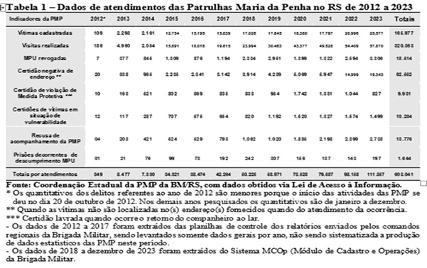 – Na Brigada Militar (BM/RS) foram criadas as “Patrulhas Maria da Penha (PMP)”, partindo-se da ideia de que era necessário abrir novos caminhos e horizontes ante as funções constitucionais das PMs, que consistem na atuação na prevenção dos delitos ou na prisão dos infratores no pós-delito. Buscou-se atendimento mais mais completo e continuado e, também, pela necessidade de uma atuação mais eficiente e em rede às mulheres vítimas de violência e, após várias serem assassinadas, mesmo com o deferimento das MPUs pelo Judiciário, inserindo desta forma a BM/RS também no rol de atendimento à violência doméstica e familiar da rede criada pela SSP/RS.