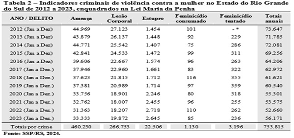 Da análise dos dados da Tabela 2 depreende-se que dos totais anuais de cada delito, percebe-se uma redução gradativa nos crimes de ameaça (de menos 25,87%) e lesão corporal (de menos 26,73%), diminuição que não se repetiu nos delitos mais graves de estupros (aumento de 45,02%) e feminicídios consumados e tentados, que se mantiveram praticamente no mesmo percentual. Porém, mesmo que alguns delitos tenham diminuído, o número total registrado no período mapeado, conforme a Tabela 2, foi de 753.815 delitos, números muito elevados e que justificam a implementação desta política pública e de todo trabalho da rede de enfrentamento à violência doméstica criada no Estado do RS após o ano de 2012.